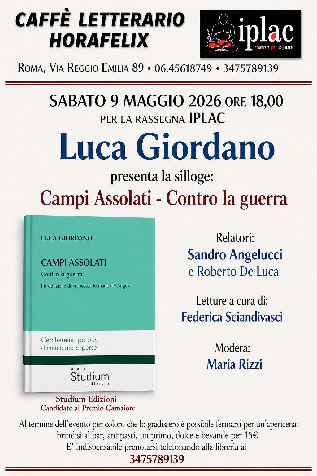 Roma, Caffè Letterario Hora Felix – Luca Giordano This event is on 9 maggio 2026 6:00pm Non c'è ancora nessun commento Lascia un commento Fare clic qui per annullare la risposta. Nome (required) Mail (will not be published) (required) Website Messaggio