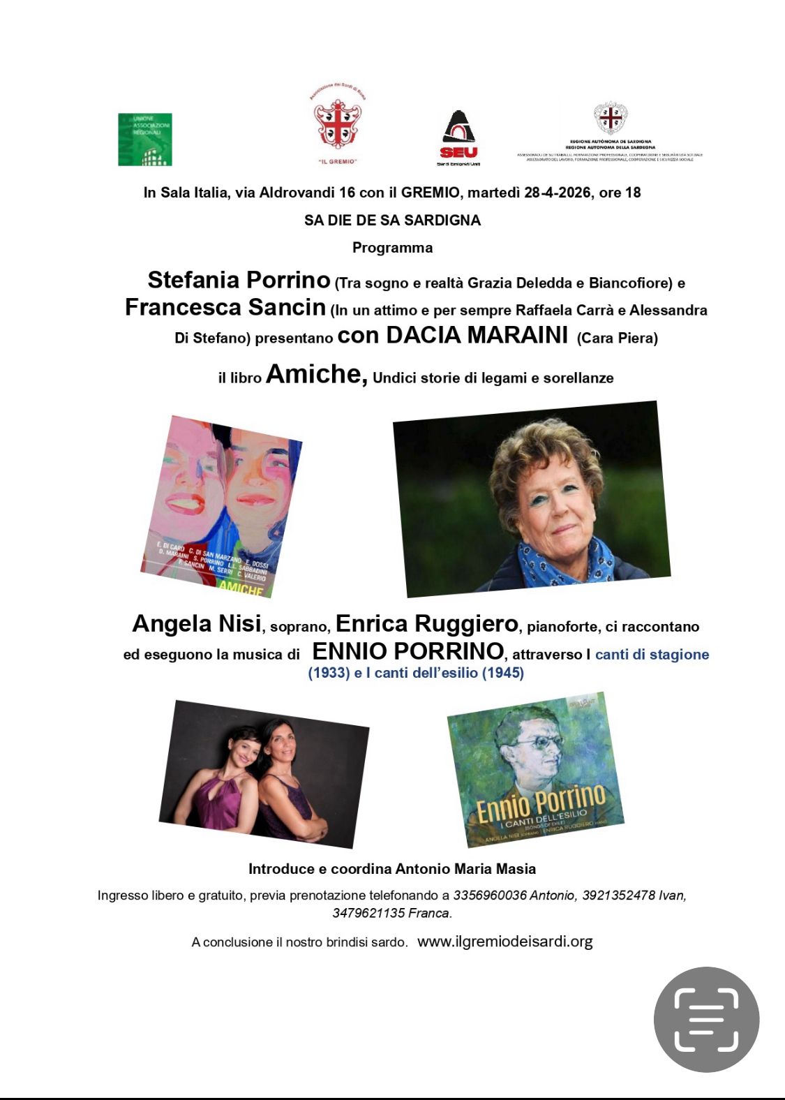 Carissimi soci e amici ricordate? Martedì 28-4-2026 ricorre Sa Die de sa Sardigna! Noi insieme a voi la celebreremo al Gremio in sala Italia, con Dacia Maraini, Stefania Porrino, Francesca Sancin e il loro libro: Amiche. E chiuderemo con la musica di Ennio Porrino, raccontata ed eseguita da Angela Nisi,soprano e Enrica Ruggiero al pianoforte. Ecco la locandina. PRENOTATE! Vi aspettiamo con gioia. IMG-20260422-WA0004